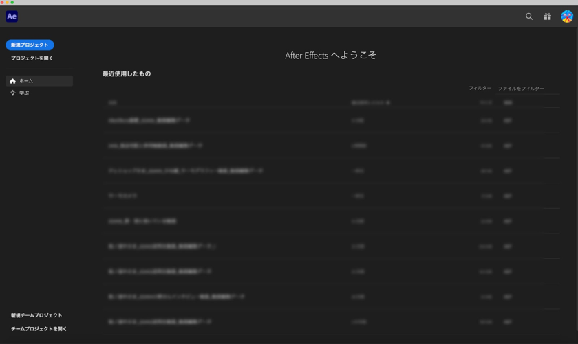 インストールが完了すると、After Effectsのショートカットアイコンがデスクトップに作成されるので、開いて確認してみましょう。