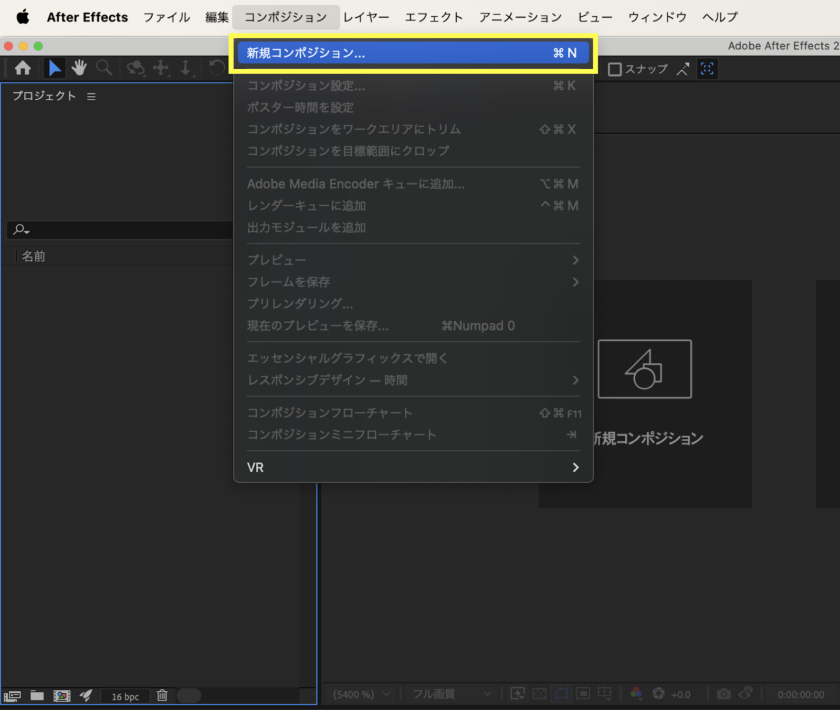 ヘッダーメニューから「新規コンポジション」を選択します。