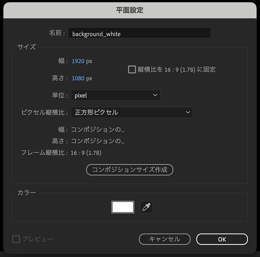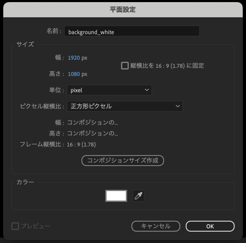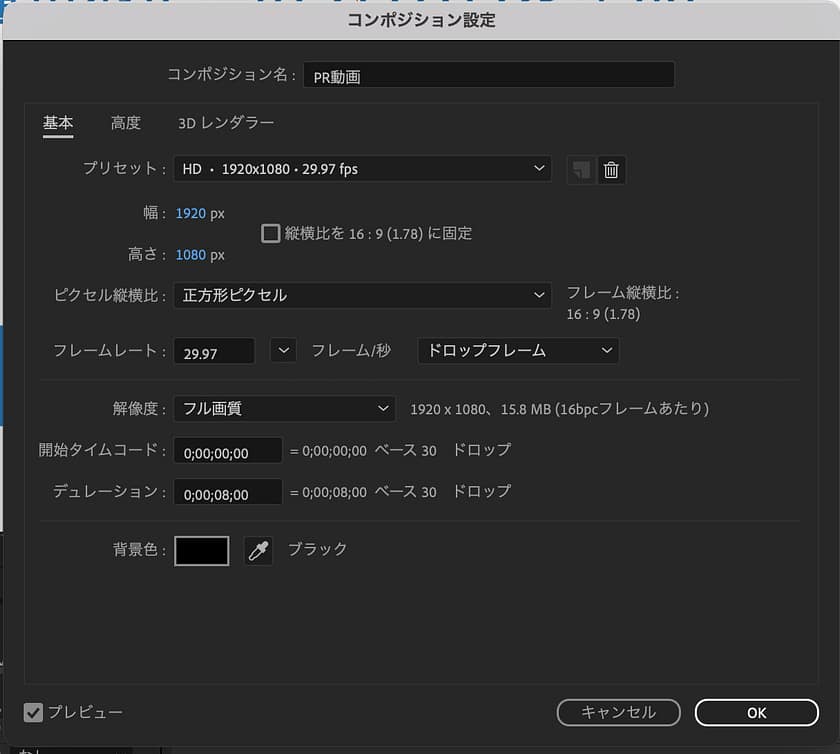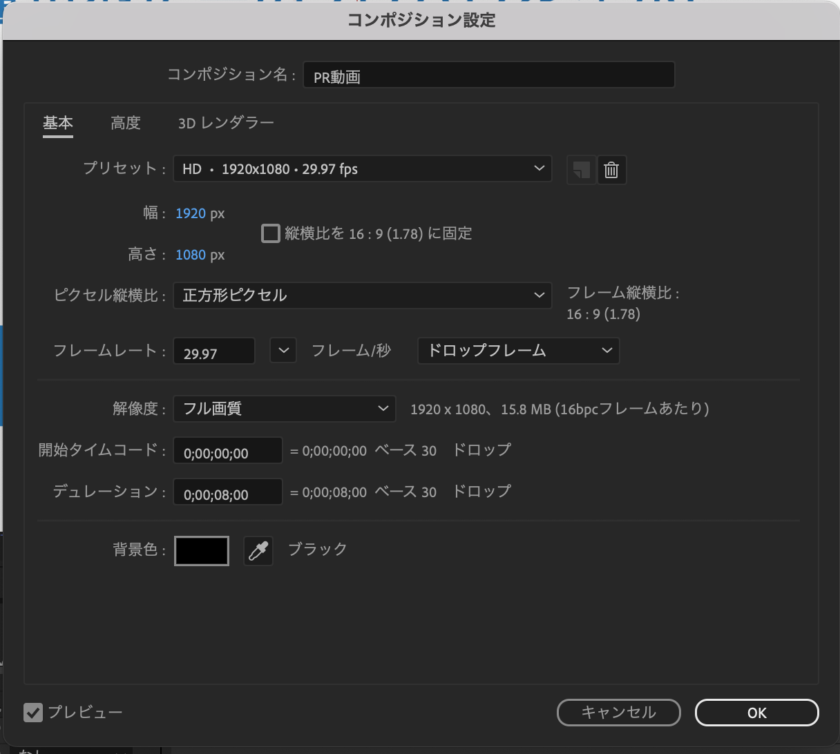 縦横比や解像度など、制作する動画に合わせてコンポジションの設定しましょう。今回は上図のように設定しました。