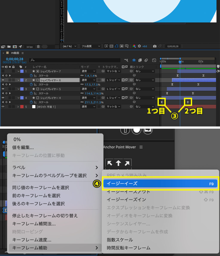 3.キーフレームを選択した状態で右クリックし、「イージーイーズ」を選択します。
