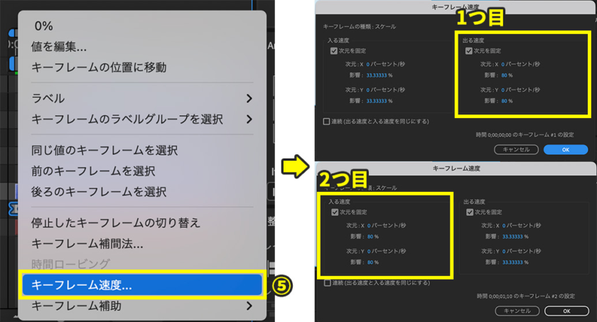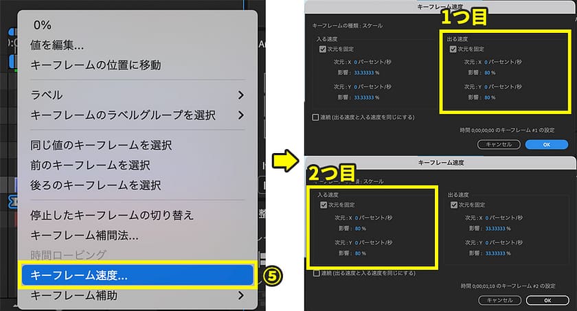 5.手順3で打ったキーフレームを右クリックし、「キーフレームの速度」を選択。下記の値に設定します。