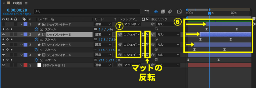 7.下の3つの丸のトラックマットに一番上の丸を指定し、マットを反転にします。