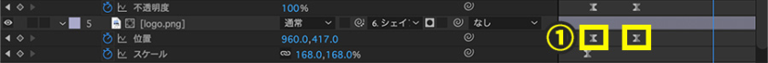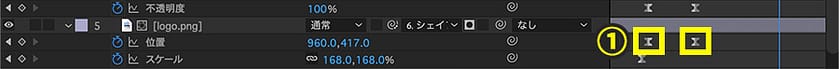 1.対象のレイヤーの矢印を選択し、アニメーションを加えたいプロパティを表示(例:位置、スケールなど)