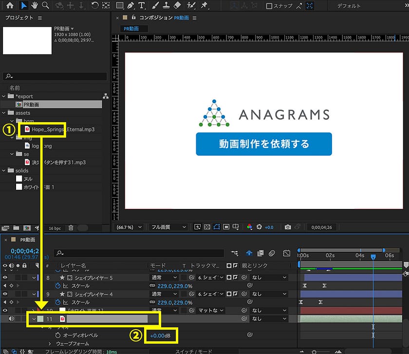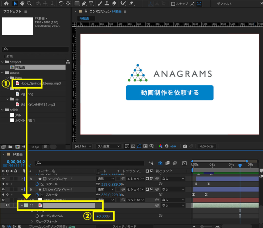 1.BGMを、プロジェクトパネルからタイムラインパネルにドラッグ&ドロップして挿入。