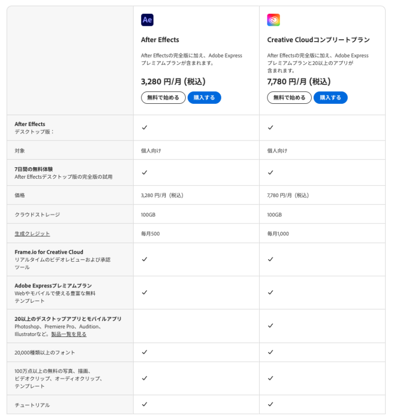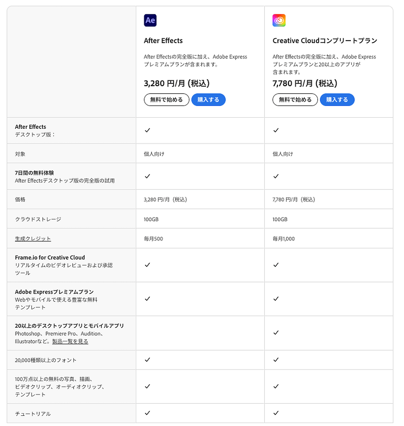 After Effectsのみを使う場合は単体で購入しても問題ありませんが、動画内で使う画像をPhotoshopやIllustratorで用意したり、Premiere Proを併用する可能性があれば、コンプリートプランを購入するのがおすすめです。