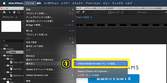 1.After Effectsのヘッダーメニューから「Adobe Media Encoder キューに追加」を選択します。