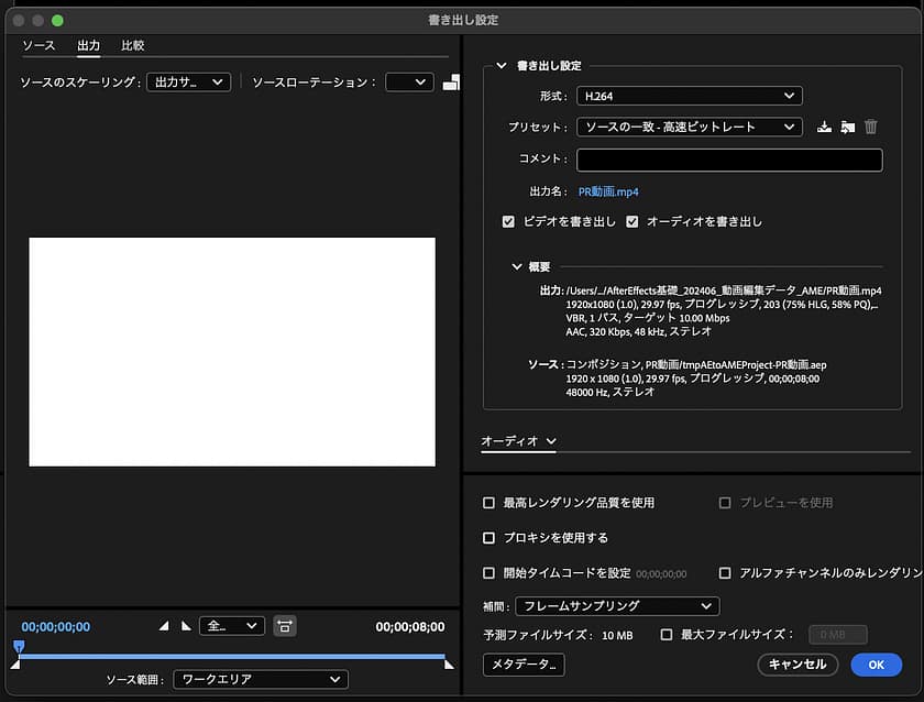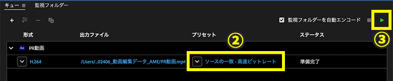 2.手順1により、Media Encoderが開きます。プリセットを選択し、形式をH.264、プロセットを「ソースの一致-高速ビットレートに設定し、OKボタンを選択します。