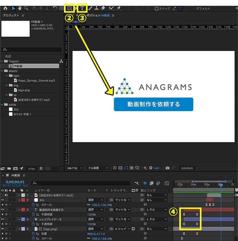 4.手順2と3の長方形とテキストに対し、不透明度のキーフレームを2つ打ち、下記の通りに値を設定しましょう。不透明度を上げてボタンを表示するようにします。キーフレームはイージーイーズに変更しておきます。