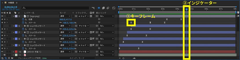 | 1 | キーフレーム | 指定した時間に、位置や大きさなどレイヤーの状態を記録しておくピン留めのようなもの |