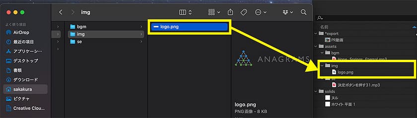 その場合は、「02_Assets」内で、静止画なら「img」、効果音なら「se」というように、フォルダを分けることが多いです。