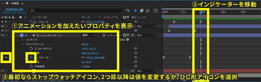 2つ目以降のキーフレームを打つ場合:プロパティの値を変更するか、ストップウォッチの左にあるひし形のアイコンを選択