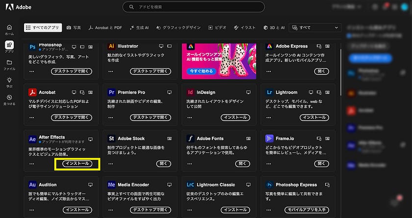 ログインができたら、アプリ画面でAfter Effectsのインストールボタンを押下し、インストールします。