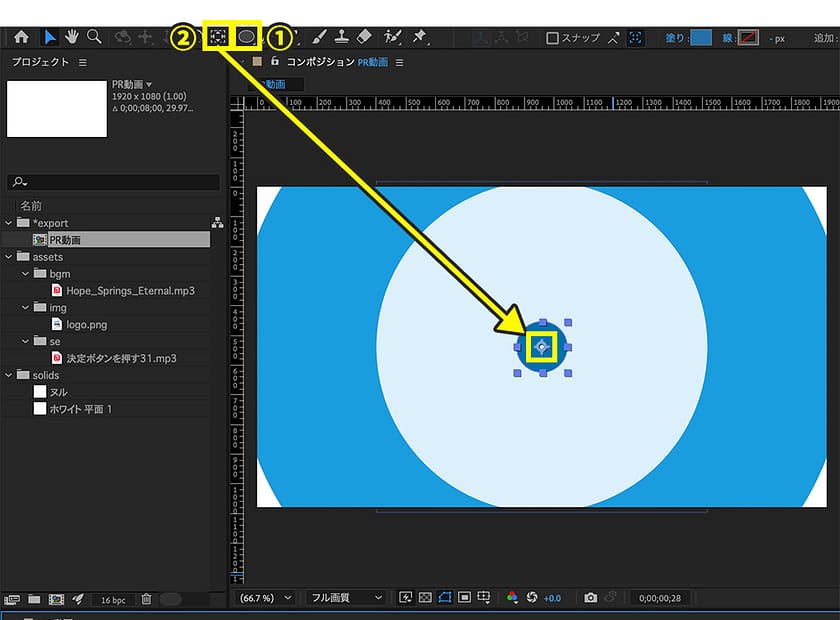 1.ツールバーから楕円形ツールを選択し、任意の色で丸を作成し、コンポジションパネルの中央に配置します。
