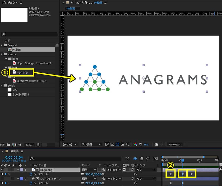 1.ロゴの画像を、プロジェクトパネルからコンポジションパネルにドラッグ&ドロップして挿入。