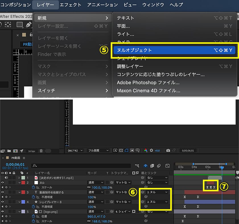 5.クリックする動きを再現するため、ヘッダーメニューから「ヌルオブジェクト」を選択し、ヌルオブジェクトを追加します。手順2の長方形に対して中央に配置されるように調節し、アンカーポイントも中央にしておきます。