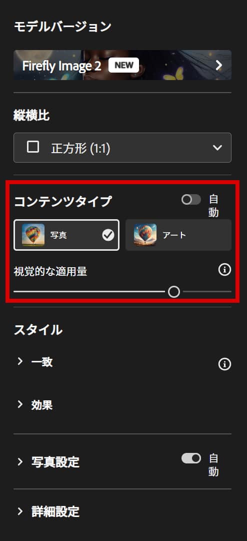 例えば「コンテンツタイプ」では、生成する画像のタイプを写真かアートか選択可能です。さらに「視覚的な適用量」というスライダーで全体的な強度を調整できます。たとえば次のような具合です。