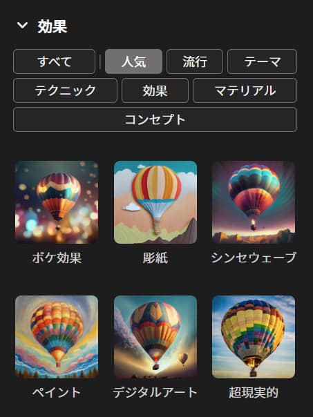 - 「コンテンツタイプ」が「アート」として設定されている場合は、デジタルアート(上)からイラスト風(右)まで変換できます。