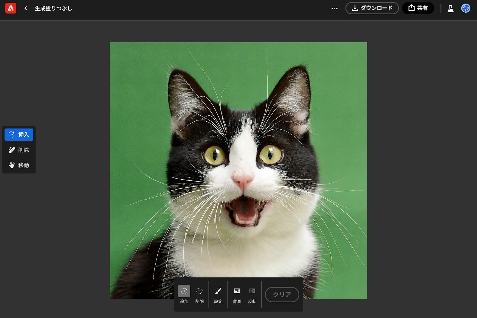 上記で生成した猫の画像にワンポイントとして「!」マークを入れたいと思います。「生成塗りつぶし」の機能から、変更を加えたい画像をアップロードします。