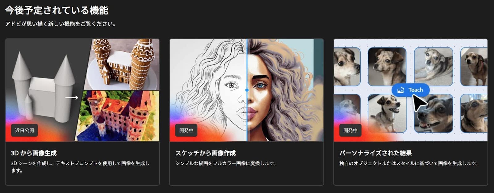 技術革新を常に重要と考えているAdobe社は、これまで多くの製品開発や主要アップデートを発表してきました。サイト内にも「3Dからの画像生成」「スケッチから画像作成」「パーソナライズされた結果」といった今後予定されている機能を開発中と記載されています。