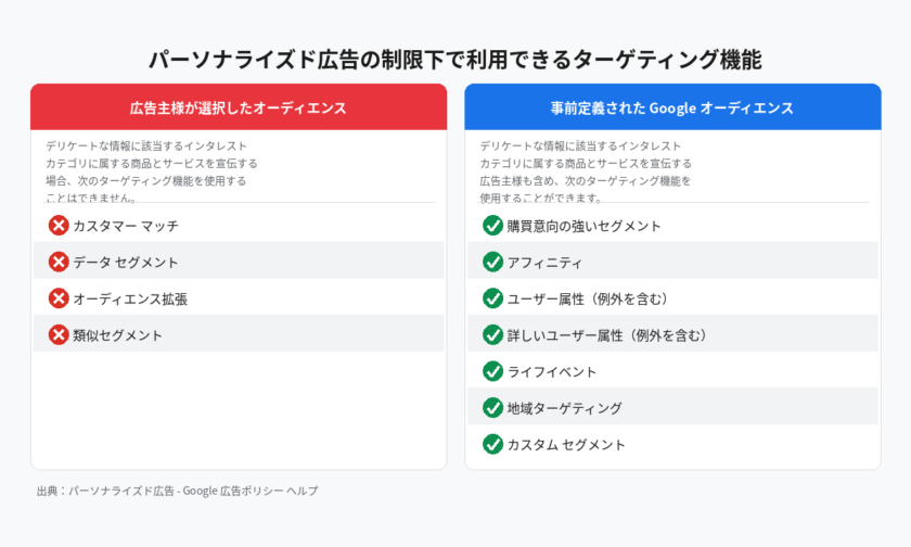 Google広告アカウントがパーソナライズド広告の制限対象となった場合、利用できるターゲティング機能に違いが出ます。