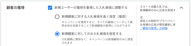 ただし、Google広告の「新規顧客の獲得」目標(顧客ライフサイクル目標)では、コンバージョントラッキングデータに基づくGoogleの自動検出がデフォルトで有効になっています。カスタマーマッチリストは使えなくても、過去540日間の購入コンバージョンデータをもとにGoogleが自動で新規・既存を判別する方法は利用できる可能性があります。精度はカスタマーマッチ併用時より低下しますが、購入のコンバージョントラッキングが正しく設定されていれば検討の余地があります。
