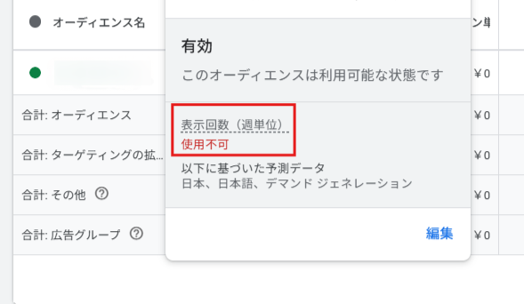 注意すべきは、これらのオーディエンスをキャンペーンに紐づけて広告をONにでき、ステータスが「有効」と表示される一方で、実際にはインプレッションが出ていない場合があるという点です。