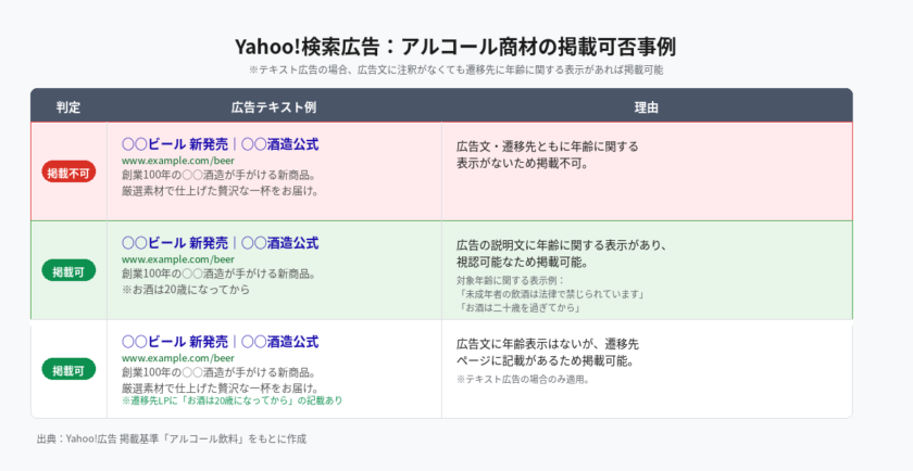Yahoo!検索広告では、遷移先のページに「お酒は20歳になってから」などの年齢に関する注意文言の記載があれば、広告の見出しや説明文に注釈がなくても配信できます。