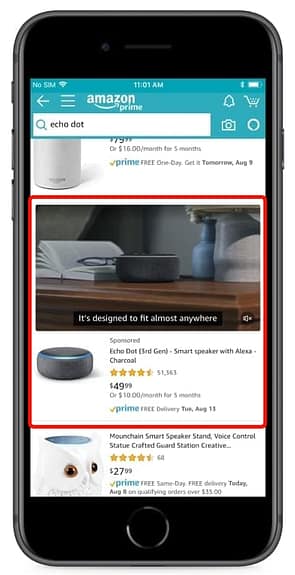 スポンサープロダクト広告など、Amazonのセルフサービスソリューションの広告メニューはほとんどが静止画像で構成されているため、動画広告は単純に目を引きやすいというメリットがあります。