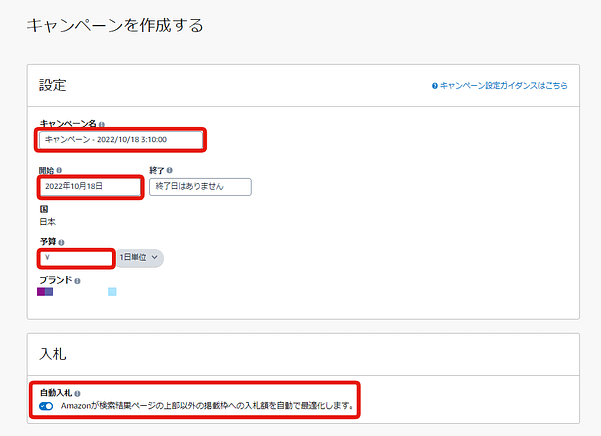 「キャンペーン名」「開始日」「予算」を入力し、自動入札の利用の有無を設定します。