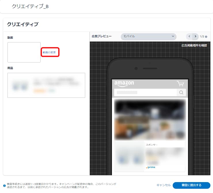 動画の変更は、広告画面の「クリエイティブを管理する」から行えます。手順は次のとおりです。