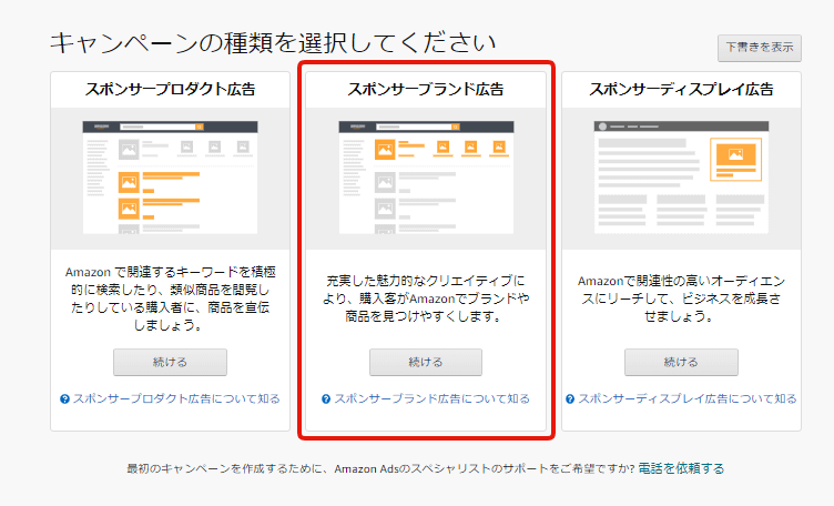 スポンサー広告のキャンペーン管理画面で「キャンペーンを作成する」をクリックし、次の画面で「スポンサーブランド広告」を選択します。