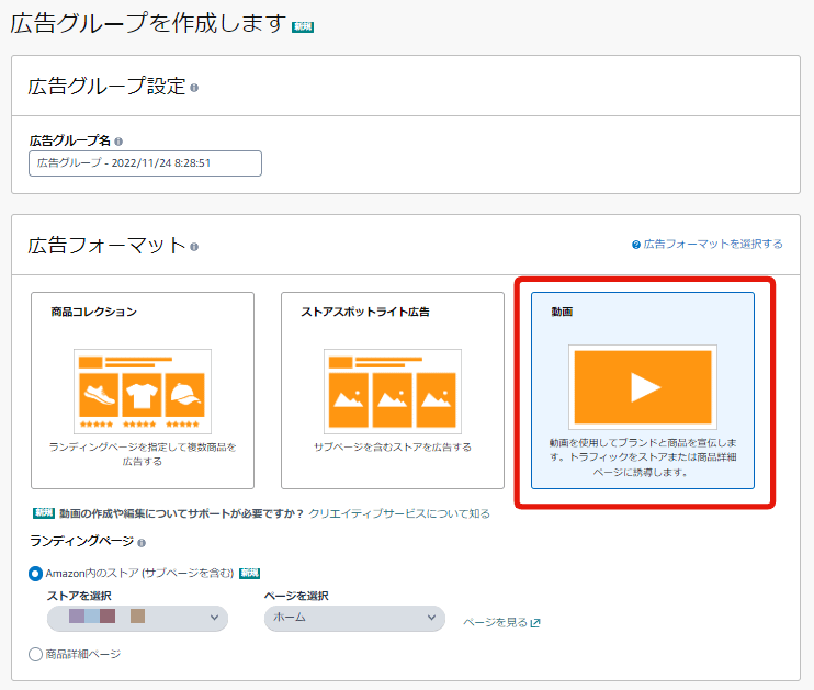 広告グループを作成します。「広告グループ名」を入力し、「広告フォーマット」と「ランディングページ」(「Amazon内のストア(サブページを含む)」か「商品詳細ページ」のいずれか)を指定します。
