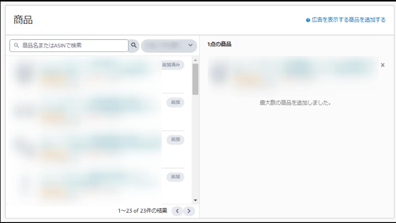 ※ランディングページで「商品詳細ページ」を選択した場合は、広告に表示する商品を1点選択し「追加」をクリックしてからターゲティング設定を行います。
