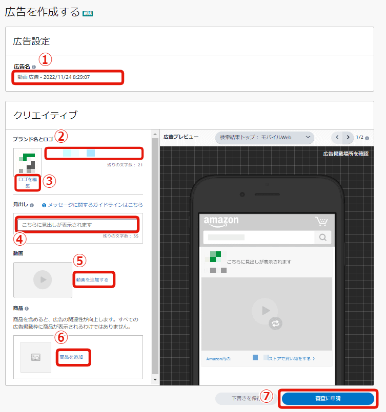 広告を作成します。以下の必要事項をすべて設定し、⑦「審査に申請」をクリックで設定完了です。
