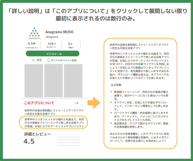 ただし、「このアプリについて」をクリックして展開しない限り、最初に表示されるのは数行のみなので、冒頭に優先度の高い訴求ポイントを配置することがユーザーの興味を引くために重要です。