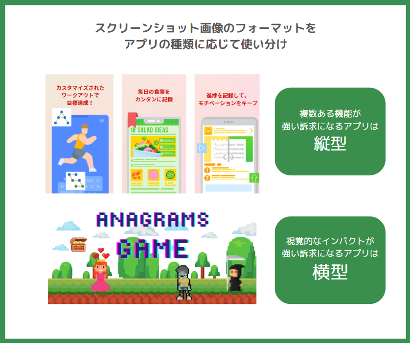 アプリの種類や強みによって魅力の伝え方も異なってくると言えます。その中で一つのポイントは画像のフォーマットを有効に使い分けることです。