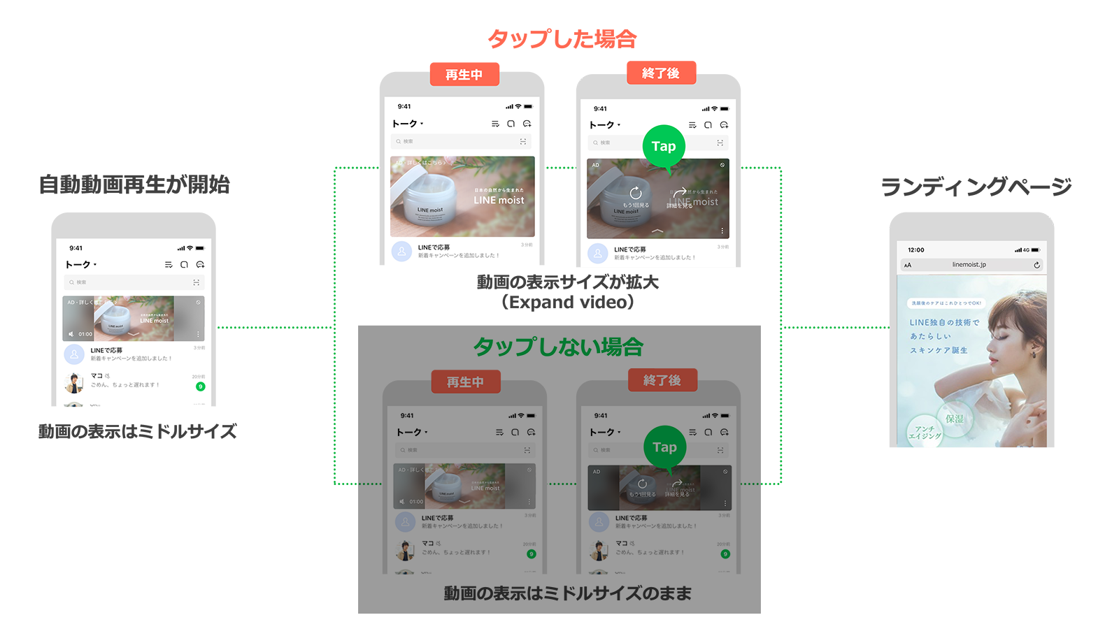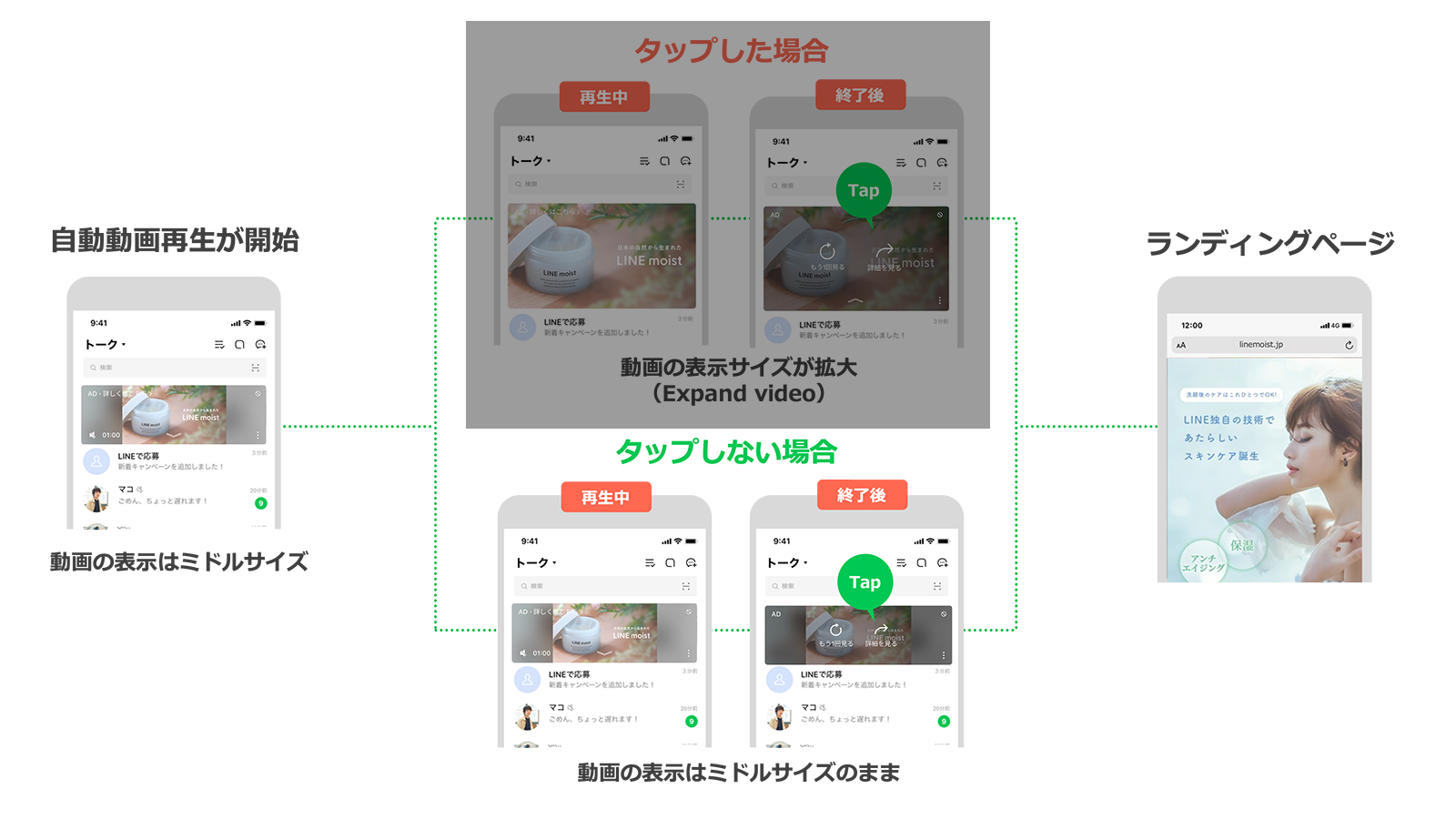 なお、LINEアプリの「動画自動再生」の設定で「自動再生しない」を選択しているユーザーには、Auto play videoの代わりに「動画+静止画」が表示されます。