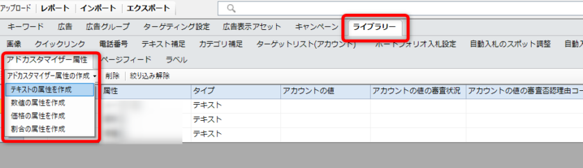 キャンペーンエディターから「ライブラリー」選択後、「アドカスタマイザー属性」>「アドカスタマイザー属性の作成」>「テキストの属性を作成」の順でクリックします。