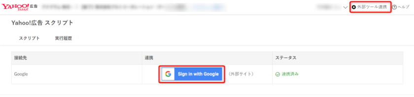 画面右上「外部ツール連携」から 「Sign in with Google」ボタンをクリック。