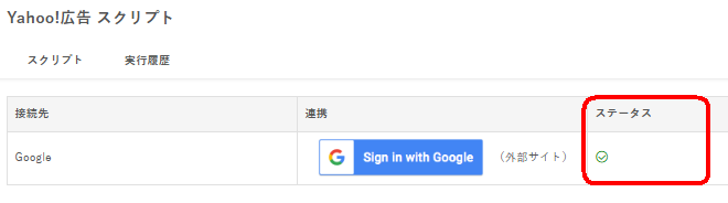 Yahoo!広告 スクリプト画面に自動で戻り、ステータスの箇所が「緑色のチェック」となっていれば連携完了です。