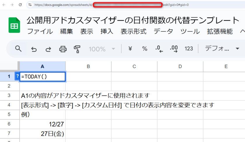 コピーしたスプレッドシートを開き、A1セルにTODAY関数(=TODAY())を設定します。