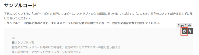 サンプルコードをコピーして、Google ドキュメントやテキストエディタに貼り付けします。コードの上部に記載のある「//設定が必須な定数」と「//設定が不要な定数」に囲まれた部分を変更していきます。