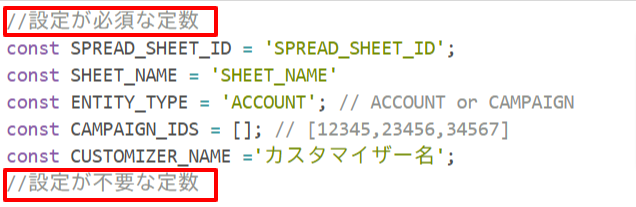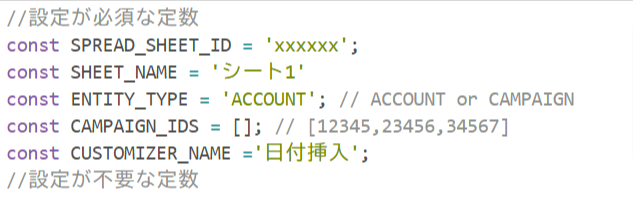 | const ENTITY_TYPE | 値のひも付け先をアカウントにするかキャンペーンにするか設定 | (例)ACCOUNT |