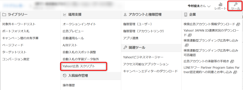Yahoo!広告アカウントの右上「ツール」から、運用支援の項目内の「Yahoo!広告 スクリプト」を選択。