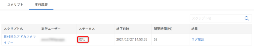 実行履歴のページに移動するので、ステータスが「成功」になっているかを確認します。