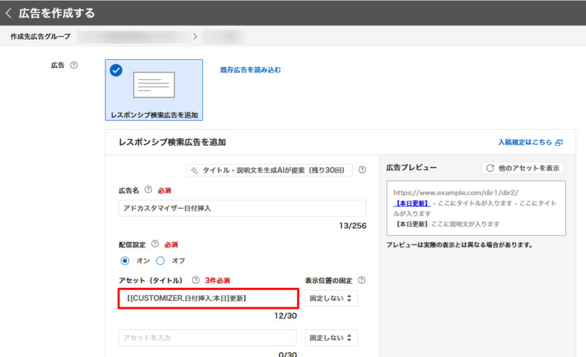 一度日付の自動挿入を設定すると、その設定に基づいてアセットが自動的に生成され続けます。更新の頻度が変更された場合は、実態と異なる情報が表示されてしまうことで、ユーザーに誤解を与える可能性があるため、広告カスタマイザの設定も見直しましょう。