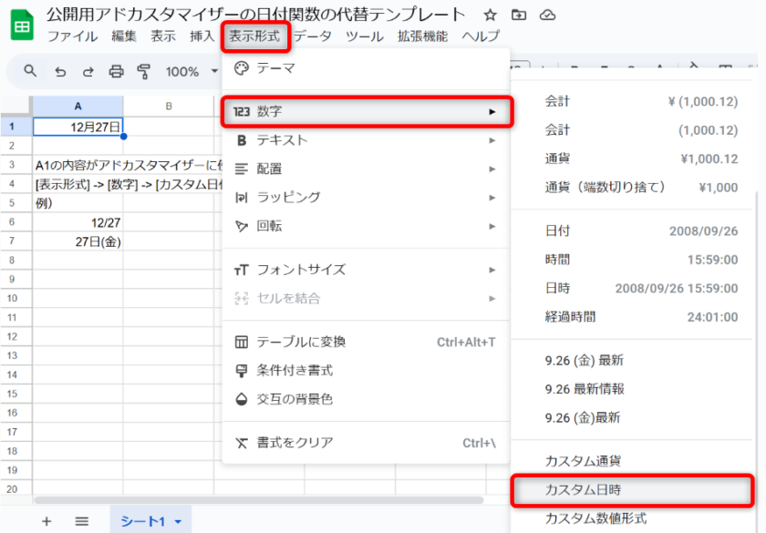 Google スプレッドシートのA1セルにカーソルを合わせた後、「表示形式」 > 「数字」 > 「カスタム日時」を選択。