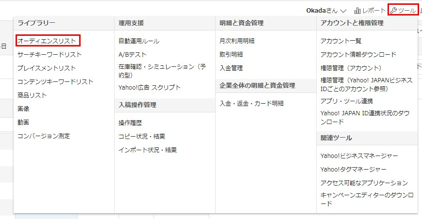 YDAの管理画面を開き、右上の「ツール」より「オーディエンスリスト」を選択します。