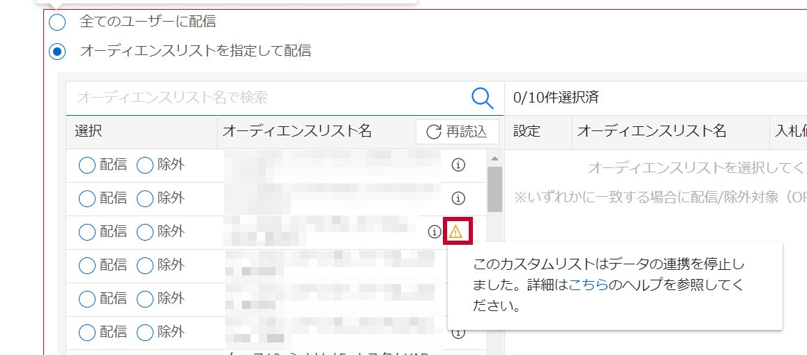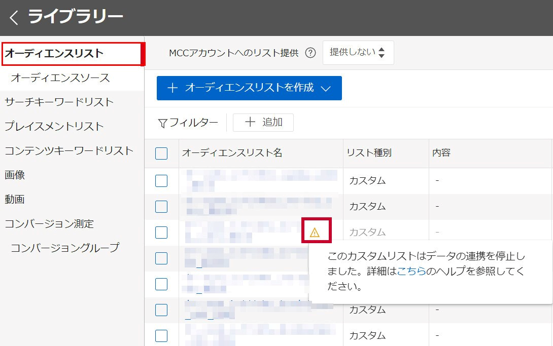 オーディエンスリスト名の横に警告アイコンが表示されているリストが、データ連携が停止したオーディエンスリストです。