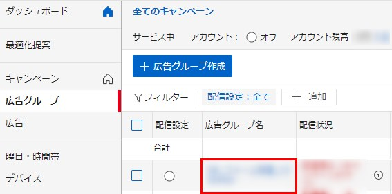 YDAの管理画面を開き、「オーディエンスリスト(カスタム)」を関連付けした広告グループを選択します。